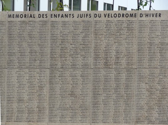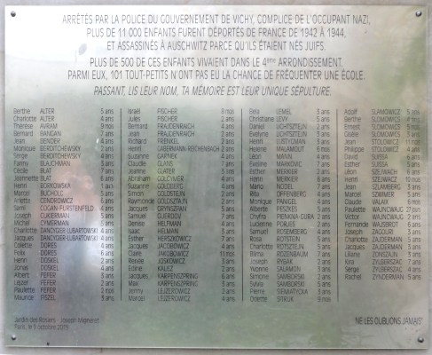 A short walk from the Deportation Memorial is the Garden of the Vel d’Hiv Children. On one side is a wall of names and ages with the following explanation: