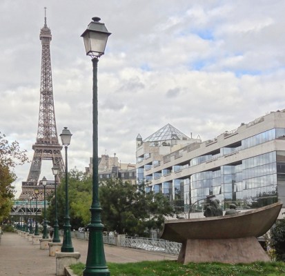 Below: the Deportation Memorial (right) and view toward Métro Bir-Hakeim and Tour Eiffel. The Vel d’Hiv (Winter Velodrome), where arrested Jews were held, was located a couple of blocks to the right in the photo.