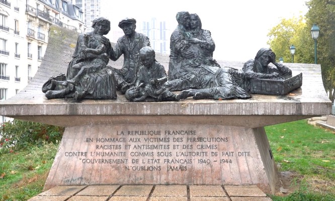 If you walk along the Seine south of Métro Bir-Hakeim, a somber sculpture of seven figures gradually comes into view. They are sitting on the ground, in a state of shock and despair. Parents hold their toddler protectively, a little girl plays listlessly with her doll, a man embraces his pregnant wife, and an older woman rests on her suitcase, leaning her head on her hand. Perhaps she’s remembering pogroms from another time and place.