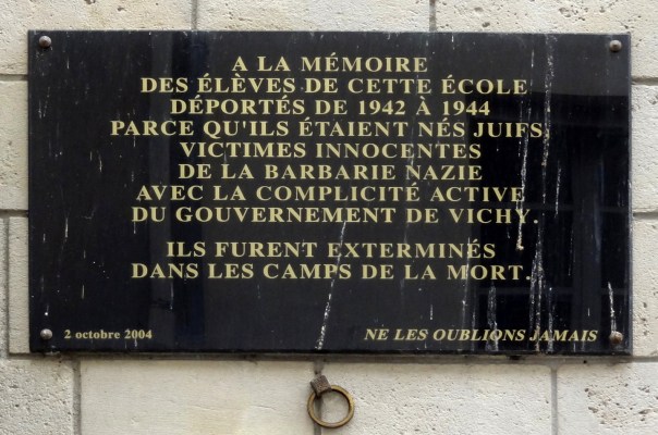 The plaque below, affixed to the entrance of a boy’s school on Île St-Louis, acknowledges that Jewish children who had attended that school were deported and murdered in death camps.