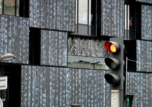 The high-tech building below is covered with twelve giant digital screens displaying artistic content.