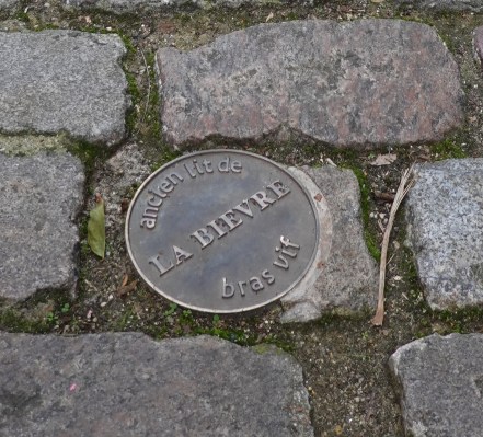 A metal disk on the cobblestones marks the location of the underground Bièvre River: