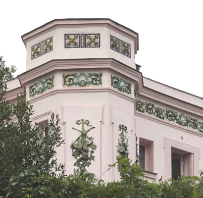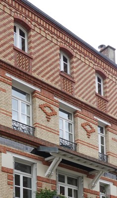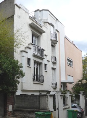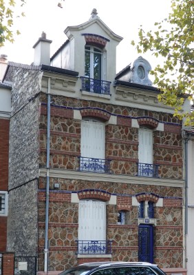 These identical houses of Rue Henri Pape were built in 1909 by socialist architect Henri Rebersat for the cooperative society La Petite Chaumière. Like the houses of Rue Dieulafoy, those of Rue Henri Pape sport distinctive architectural features: jerkinhead or Dutch gable roofs, popular in Germanic countries, and decorative wooden balconies.