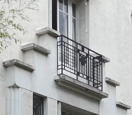 The forty-four middle-class row houses of Rue Dieulafoy were built in 1921. Their distinctive Mansard slate roofs and recessed windows unify the row. On the other hand, the varying trim details such as window parapets, pillared gates, and quoins give each house a degree of individuality.