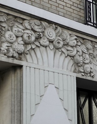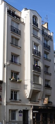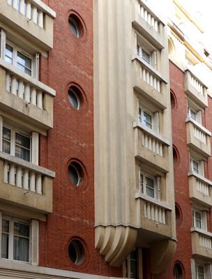 Below: A 1914 apartment building whose brickwork resonates with Art Deco. The rounded shape of the building also foreshadows the Art Deco “ocean liner style” (Fr. Style paquebot) of the 1920s, a streamlined form borrowed from the shape of luxury transatlantic liners.