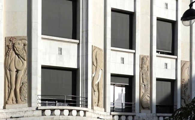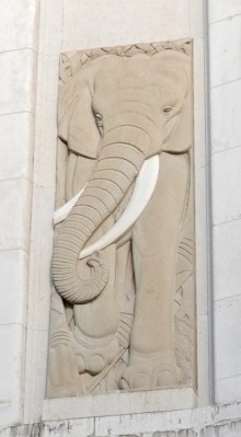 Across the street from the Chapel Expiatoire is this whimsical building with panel friezes of finely carved animals: camel, elephant, alligator, shark among coral: