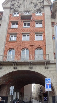 The edifice through which one passes to enter the lane is a drum roll from the 17th century — in reality, a counterfeit. During the early 1930s, architect Joseph Marrast was commissioned to design Carrefour Curie, a residential building with a portico entrance to the Rue de Nevers. The structure was to reflect the architectural style of the 17th century, but the concrete archway and the style of the frieze at the top betray its more recent age.