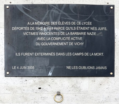 Memorial plaque at the entrance to Lycée Charlemagne acknowledging the deportation from 1942-1944 of Jewish students to death camps, “innocent victims of Nazi barbarism, with the active complicity of the Vichy Government”: