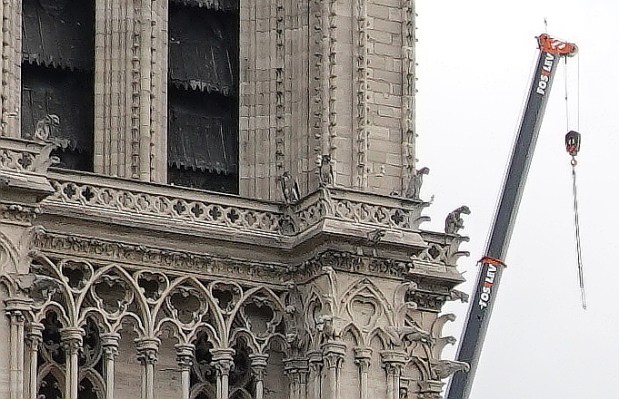 At the time that fire broke out in 2019, metal scaffolding was in place to make needed repairs to the roof. Although that scaffolding survived the fire, the intense heat melted the metal, which then fused with the roof. To facilitate the removal of the melted metal during the restoration of Notre Dame, a second metal scaffolding was erected.