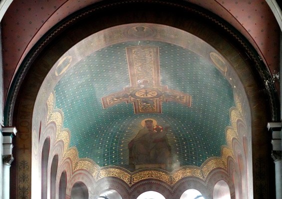 The painting on the ceiling of the apse reflects the Byzantine influence on Romanesque churches, consistent with the Romanesque style of the 11th and 12th centuries. Gold stars on a dark green field provide a backdrop for paintings of a Virgin in Majesty and a crucifix.