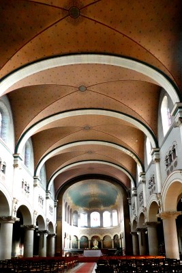 Inside, the church’s nave and choir could be described as a harmonized blend of Romanesque and early Gothic, or Romano-Gothic. The curved arches in the nave echo the older Romanesque style, whereas the vaulted ceiling — while not yet soaring — registers “Gothic.”