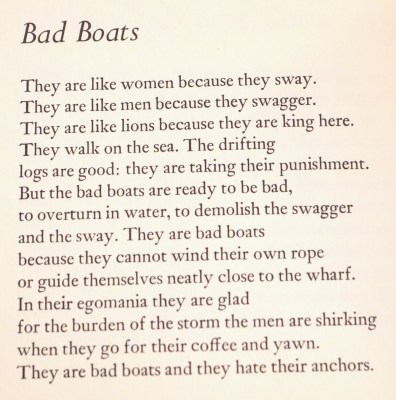 Laura Jensen’s title poem of Bad Boats hasn’t lost any of its appeal since I read it more than twenty-five years ago. Neither have its egomaniacal protagonists, the boats to end all swagger and sway.