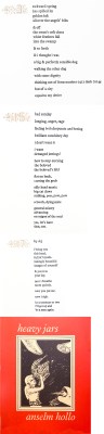 Below are poems by Hollo from one of my most treasured poetry collections, published in letterpress by Toothpaste Press: Heavy Jars (1977). A beautiful book in every way.
