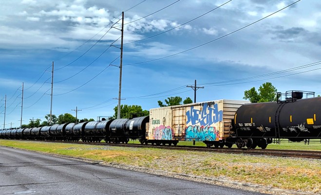 A fleet of Union Pacific locomotives hitches a ride along the NOPB railroad, perhaps heading to pasture or overhaul. (Backstory below)