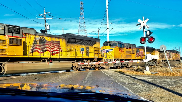 Twenty years ago, Union Pacific graphically redesigned its locomotives to honor the victims of 9/11. Note the design flaw above: engine heat has damaged and discolored the oversized and ill-placed American flags.
