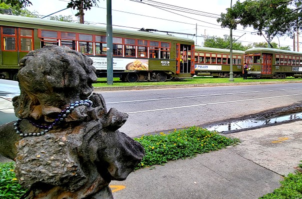 Concrete angel with Mardi Gras beads prays for solution to traffic jam