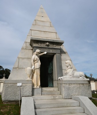 Photos from a visit to Lakelawn Cemetery in New Orleans. First, the Egyptian revival-style mausoleum of Lucien Napoleon Brunswig (1854 – 1943), a French emigré who made a fortune in the pharmaceuticals industry: