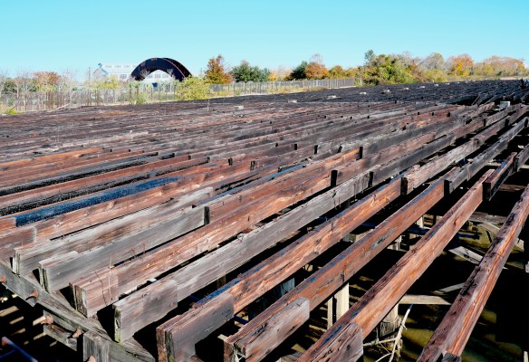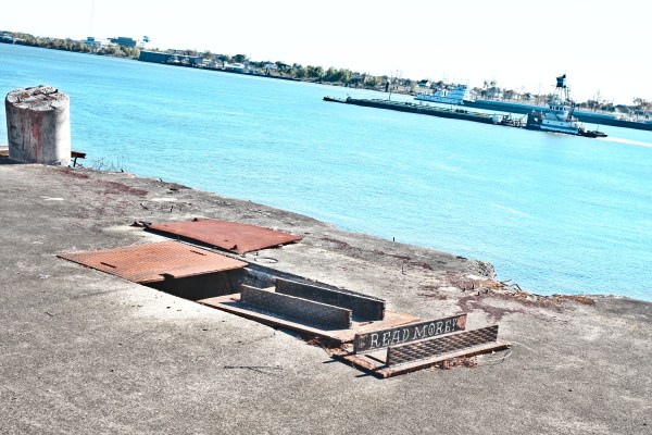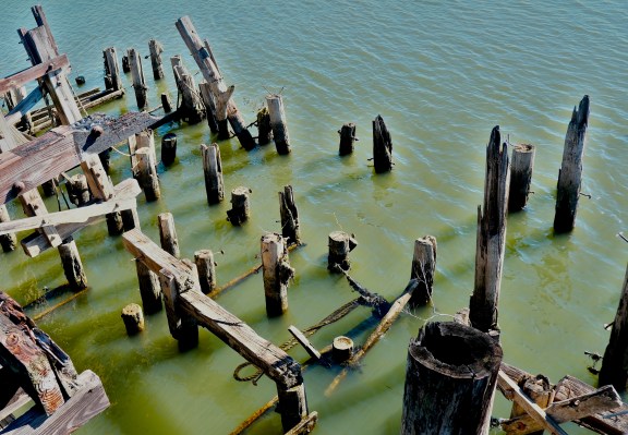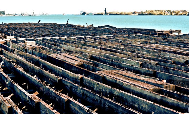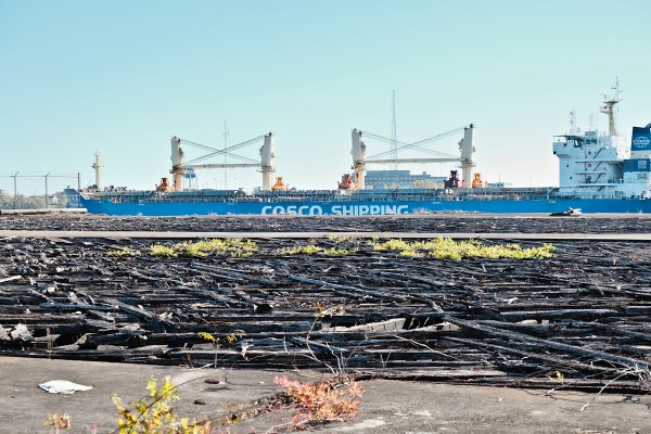 The remains of an old loading dock make it appear that the Cosco ship below is log-jammed.