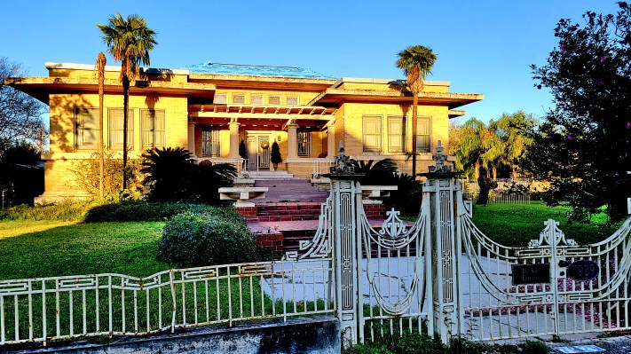 The horizontal lines of this 1918 home show the influence of Frank Lloyd Wright on architect Edward Sporl, who designed it for banana magnate Salvador D’Antoni.