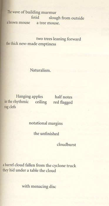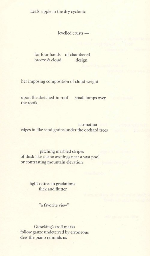 The medium of Guest’s musical language produces not a description of a place or person, not anything classifiable as strictly mimetic, not a building wave of description that prompts the readers to say (to quote Helen Vender) “Heavens, I recognize the place, I know it!” According to Vendler, the reader’s eureka moment resulting from the accumulation of descriptive language “is the effect every poet hopes for.” Oops, she forgot Barbara Guest, whose work instead displays a fascination with the possibilities of language itself. A composer might ask, what would happen if I have a flute echo this motif introduced by a violin? Guest asks, what would happen if I put these words and sounds in various contexts, producing motifs that repeat but that also express rich variation?