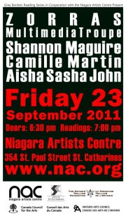 I’ll be reading with Shannon Maguire, Aisha Sasha John, and Zorras Multimedia Troupe—a treat to be reading with these terrific poets! And many thanks to Eric Schmaltz and the Niagara Artist Centre for making this event happen.